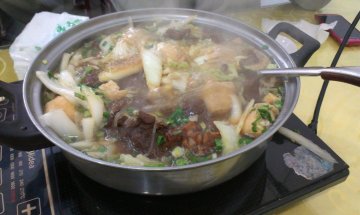 今天阳光明媚,和办公室的同事心情大好,决定出去觅食。计划了半天,本来决定是去藏书羊肉店吃羊肉面的,可是一看到招牌上的菜单,大家就被羊肉火锅吸引住了,于是决定该吃羊肉火锅。一份羊肉火锅的价格是75元,老板娘说里面会放55元的羊肉,我们选择了红烧羊肉。羊肉汤是现成的,老板在锅底里再加入大白菜、油豆腐和粉丝,倒入称好的羊肉,稍稍大火煮一会,就送到我们桌上的电磁炉上了。虽然我们有些诟病老板娘羊肉放得太少了,但还是不得不折服于羊肉的味道鲜美,汤汁的香浓。里面的配菜是大白菜、油豆腐和粉丝,毋庸置疑,大白菜是最多的。前期的汤锅里,油豆腐是美味,它的褶皱里狠狠的吸收进了汤汁,一口咬下去,鲜美的汤汁就噗的溢满了口腔。到了汤锅的后期,起前不起眼的大白菜,在锅底蛰伏了许久后,让滚烫的汁水把自己提炼成外嫩内脆,同样是内涵深厚。不过这两者再好吃,还是只能作为藏书羊肉的配角,羊肉纹理分明,羊腩有嚼劲,羊肉皮胶质丰腴,味道香浓甜美,就是量太少啊。结账的时候,收了79元,原来我们要的两碗米饭是2元一碗,可是我一开始开以为米饭是送的呢。