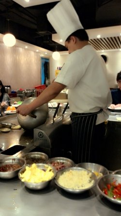 他们家做的是台式的铁板烧,东西还是不错的,厨师按照客人的要求当场烧,而且最主要的是再客人面前当面料理,绝对不怕卫生情况太差啊,他们家的香脆鸡排味道不错很好吃,用切成一块的鸡肉加上一些大蒜还有辣椒一起炒,香味无比啊,而且鸡肉炒了之后比较嫩脆,加上略微的辣口感还是不错的