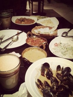 总体菜品的味道还可以,咖喱味道柔和,香料味道比较喜欢。咖喱角好吃,小脆饼也不错,就是太小,印度的馕也好小,卡戴牛肉忒小份了,还有这个贻贝大皇虾,就几个海虹和少的可怜的小基围虾就128米,也太坑人了吧!七八百的一顿饭感觉也就值一两百。表示以后不会再去了。…查看更多