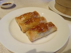 蔚景阁一个很有诗意的名字,朋友介绍来的,说是菜式口味都很不错。点了鲜虾春卷、红烧肉、叉烧酥。叉烧酥个头有点偏小了,吃一个肯定是不过瘾的,味道还行,传统的粤式点心。鲜虾春卷是我最喜欢的,外面炸得很酥脆,但不会很油,里面的虾肉恰当好处得反映出鲜美的滋味。红烧肉对我们上海人来说应该算是家常菜了,所以也没太大感觉,顺便提一下他家可以加蛋的。
