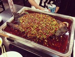 这家的烤鱼还是蛮著名的,每天慕名而来的食客还是蛮多的烤鱼就是要吃烤鲢鱼,因为鲢鱼肉肥刺少,营养价值还蛮高,性价比很高啊看着他们杀了一条鱼,这条鱼还是蛮大的啊,烤出来的鱼上面好多花椒、辣椒、香料里面的鱼汤都是红红的,辣的呛人啊,鱼下面还铺垫了一些菜什么的感觉还是蛮大一盆的,很划算,几个人都吃不完啊