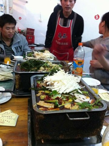 端午这天和lg孩子就在汉街过了,吃这吃那完全都没饿,胡乱转转就决定吃个烤鱼当晚餐了。过节的时候啥店子都差不多爆满,这家人也很多,所以鱼上得很慢,等了半个多小时,鱼端上来了是用不锈钢平盘子盛着的,下面还有炉火烘烤,不过火很小装饰性更强一些。鱼身上铺满了辣椒和芹菜段,鱼肉下面还有黄瓜丁豆油皮等打底。鱼肉很烂,不过在辣油里焖后吃起来倒是挺麻的,刚开始没觉得有几多辣,不过吃到一半的时候辣度上来再加上花椒的麻,就有点流汗了。配菜里面我喜欢黄瓜丁,很脆,带着咸咸微微辣。芹菜是细的那种,是半生的吃起来没有进味。说是三斤多的鱼我们两个人倒是可以全部吃完,加上一些小炒,吃得挺饱。
