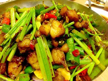早就去过了,今天在别的地儿,吃水煮鱼的时候又想起他家的泼辣鱼,真心不错。端上桌后,扑鼻的麻辣味儿闻的口水都快流出来了。大块儿的江团鱼,肥厚细嫩。蜀鱼儿包公鸡:用的是乌鸡,营养肯定会比普通的鸡肉高一点儿。像小山一样高的辣椒下,藏着炸得酥脆得乌鸡。香味儿已经深入骨髓,辣的过瘾。小碗肥肠:炖肥肠应该算是最经典的做法,卖相虽不精致,但却是最能吃出肥肠味儿的做法。
