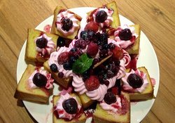 这家店是谢娜开的,就在世贸天阶MALL南街,人特别多,很火,等位就等了好久。点了这道火焰法式蜜糖吐司,端来后服务员会给点燃火焰,真是特别的漂亮,不过回过神等照相的时候,已经熄灭了,不过摆盘依然很好看。面包都切成小块,上面搭配蓝莓果和果浆还有奶油,特别好吃,就是价格贵了点,一份108元呢。查看更多