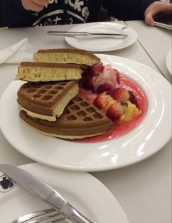 环境很不错,店面以白色为主基调,有很多可爱的小熊哦~等位的小熊有点脏,不过摆饰的小熊很好看,随手拍的~招牌拿铁,开卡送的,好喝到惊艳哦~比星家的味道还要浓郁,奶泡久久都不会消退的那种,还有苦苦的巧克力味道,赞一个~冲着这家的华夫饼去的,果然没有失望,时令水果都很新鲜,软糯香甜的华夫饼足够两人分享了~热的外皮很脆很香,蛮有口感的~查看更多