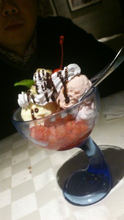 这家的牛排感觉一般,圣代也是,看上去不错,但味道一般,选用的冰激凌不好吃,感觉就是普通的冰钻味道,上面还有奶油啊,巧克力酱什么的,一加上去就感觉太腻了,而且下面的水果也不是很甜,吃完冰激凌再吃水果,好酸的味道