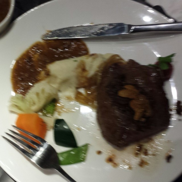 这里的服务也相当的周到。印象很深的是这里的超级大的“菲力牛排”这里的牛排分熟度可以让客人选择。不过我比较喜欢7分的感觉,切下去还是吱吱作响的牛排,而且吃上去嫩呢的滑滑的,黑胡椒的感觉很浓郁。缤纷时令水果沙拉也不错的,色拉很清爽而且水果都是很喜欢的,就是酱料太甜了。