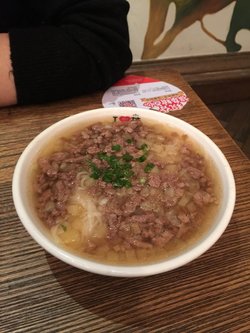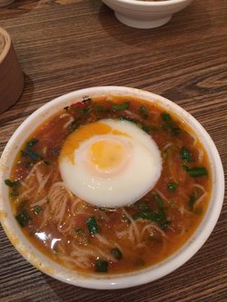 又贵又小的一款面条啊,不就是上过某电视节目嘛。还好这是某银行的积分兑换。整碗面的样子蛮好看的。太阳蛋是用烤箱煎的,蛋白很白,我喜欢油煎得,有点焦的那种。空心挂面吃上去的口感比较软,面条咬上去有汁水,估计是面条内部也渗入了汁水。汤底酸酸的,有点微辣,很开胃。
