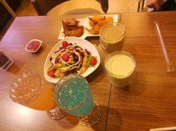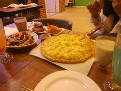小店不大,一共两层楼,10张左右的桌子,有免费的wifi,速度很快。店虽然不大,但服务员加后厨的人员却挺多,不过人虽然多,上菜的速度却很慢,它家环境很好,很安静,很适合情侣约会。它家有团购,98元双人套餐和78元100元代金券,两个人吃的话建议买代金券,因为可以选择个小点的比萨,并且口味也可以选择,它家的比萨种类还挺多的,榴莲比萨只是其中一种。小张9寸的榴莲比萨58元,比萨本身金黄色的,榴莲像奶油似的铺满了整张比萨,但芝士感觉不多,没有平时吃必胜客比萨时的那种拉芝士的感觉。比萨饼很薄,比必胜客的要软很多,凉了以后也不会变硬,榴莲奶油很多,里面加夹着几块榴莲肉,量很少,味道偏清淡,榴莲味不是特别浓,甜度适中。它家的饮品比较贵,一杯金桔柠檬,量不多,就要15元,味道并没有多好喝,里面还加了不了的冰块,感觉很不值,这种饮品在旁边的kfc顶多卖7元,它家却涨了一倍。新奥尔良鸡翅跟kfc的差不多,一对8元,一个翅根一个翅中,个头很小,油份稍微有点大,味道跟kfc的一样,不过没有kfc的甜。薯角其实就是大块的薯条,外皮没有去干净,部分还带着土豆皮,里面很面乎,没有薯条的那种酥脆的感觉,同样也是沾着番茄酱吃。鸡米花不错,量比较足,而且才10元,这个感觉很合适,外酥里嫩,颜色要比kfc的发暗,不辣,kfc的是辣的,味道很香,最喜欢吃这个了。查看更多