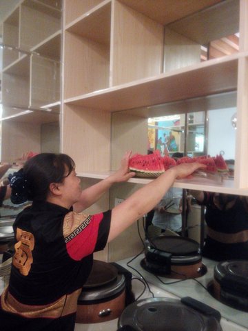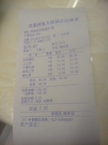 大融城负一楼新开了个美食广场,有很多餐饮商家,其中一家就是诸葛烤鱼;周末朋友相约来这里用餐。 淡绿色的装修风格其实还算小清新 水果米饭是自助,可是水果盘放得太高,工作人员取放都不方便,更何况客人 最后说说菜品,既然是烤鱼馆,少不了要点份烤鱼;我们只有两个人,所以只要了份烤鲫鱼,翡翠青椒。可惜淡而无味,不推荐。在鱼汤里还可以烫菜,素菜大概是8元一份,没点;【上上签】16一份,其实就是凉拌串串,略微有点酸味,性价比不高。【香烤土豆】12一份,孜然味太重【手撕包菜】太油啊太油,看吃完了以后碗底那一汪油,汗一个【晒单】注:餐位费是5元一位哦,包括了餐巾,水果和米饭【其他】现在的促销活动,吃一条送一条。…查看更多