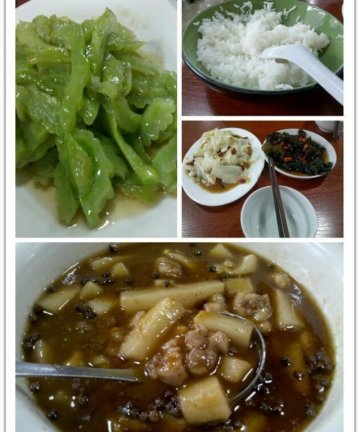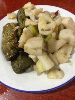 大包子2元,葱肉芽菜小包子1元,香菇肉。。香菇太油腻咯,吃半个就打闷咯,芽菜的还行。。酸辣肥兔,加咯泡椒和酸菜,味道还不错,粉丝打底,很下饭。。蚂蚁排骨,小伙伴说,很像是鸡米芽菜的做法,把鸡肉末换成了排骨。味道干香入味,好吃。。川北凉粉:味道还行,就是咸咯点。。番茄煎蛋汤:没有肉的汤都是6元,有肉的12。服务还行,环境一般