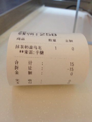 这是我最近挺喜欢的一家饮品店,里面有各种选择,像是奶茶、养生茶、咖啡、贡茶等等都有,最近还新出了爆米花貌似,下次去尝尝。店里的经典是奶盖,有点点类似奶绿的赶脚,适合像我这样不是很爱吃甜食的人。我上次点的是抹茶奶盖,很大一杯,上面是奶盖,挺浓的,有点像是奶油,但是只有淡淡的咸味,下面是抹茶,茶味比较浓,不过喝起来也挺清爽的,不像外面那种奶茶喝起来很腻。价格是15元,量比较多