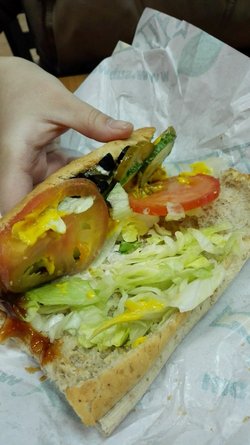 上周团购了一份赛百味的单人餐,因为新注册了一个美团账号,所以新用户是1元单人餐哦,挺便宜的。我去的是人寿大厦店,这家店坐车75、650到朝阳门外下车,路南就可以找到人寿大厦,靠近丰联广场,挺大大厦,这家店在地下一层。店内不大,但是挺干净的,服务态度也挺不错的,没有因为团购而区别对待。先验证号码很快,然后到另外一边排队,人还行不算很多,因为快餐也挺快的。我选了蜂蜜燕麦面包,然后选了金枪鱼的,从头到尾都是亲眼看着制作的,蔬菜除了洋葱和青椒都要了,酱料要了烤肉酱和黄芥末酱,另外饮料给了杯子自己打,可惜我喜欢的柠檬茶可能没有了,只好打了酸梅汽水。酸梅汽水很不错,酸酸甜甜的,有点气泡。金枪鱼三明治,很大一个,路上饿了就都吃了。金枪鱼的是鱼泥,当时店员挖了2大勺,很软嫩的金枪鱼泥,味道很鲜美,蔬菜也都很新鲜,西红柿2个大片,还有黄瓜片、生菜等等,还有喜欢的就是黑橄榄了,很多女孩子都喜欢要,软软的,多要了一些。还有酸黄瓜,酸酸的吃起来很开胃,也多要了一些,虽然比普通黄瓜软,但是也不失那种脆脆的口感。酱料里面的黄芥末酱不怎么辣,不太能吃芥末的可以选择,或者还可以要蜜汁芥末酱好像也不错。查看更多