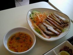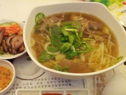 友谊商店东侧,还比较好找,门脸不算太大,中午不到12点到的店里,还没人呢,我是头一个~~~要了小份的嫩牛粉,这个感觉一般吧,牛肉不是太多,粉的口感也不是特别的筋道~~~配的小吃要了春卷,炸的,蘸着料汁吃,味道稍微咸了点,还凑合吧~~~饮料要了青柠薄荷冰,呵呵,这个超喜欢,酸酸甜甜的,非常好喝!第一次发现,原来青柠泡水竟然这么好喝,而且他家也舍得用料,放了两块青柠,味道很浓,不错!单点了一个青芒果沙律,这个也很好吃,非常清口开胃,呵呵,原来青芒果也这么好吃啊~~~还点了一个烧猪颈肉,肉片稍微有点肥,不过蘸料非常的好吃,呵呵,于是一切肥腻就可以忽略不计了~~~奶冻,这个一般吧,奶味不是特别的浓郁,不过清淡些也还可以~~~总的来说,他家还是个挺不错的小店,性价比很好,价格不贵,有兴趣的话,真的可以去试试~~~…查看更多