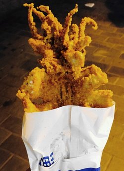 轰炸大鱿鱼,北京东城区鼓楼东大街131号, 地安门 还是挺好吃的,炸的比较透,味道也很好,鱿鱼肉嫩嫩的还是挺好吃的,外焦里嫩的感觉,比较好吃的,个头也比较大,还是切开后比较方便,整个拿着不大好吃的,孜然的原味的都比较好吃的,还是挺不错的。查看更多