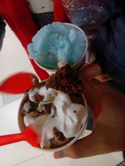 这家开在太平洋百货地下一层,可以堂吃,吃好午饭没事干就晃到那里吃冰淇淋啦,点了巧克力味,配料加了kitkat,因为前不久吃过小哈家的巧克力味的,想比较一下差别,酷圣石的巧克力味冰淇淋味道很浓很醇厚,加了kitkat后,感觉味道更有了层次,就是觉得热量好高,吃好觉得好饱。查看更多