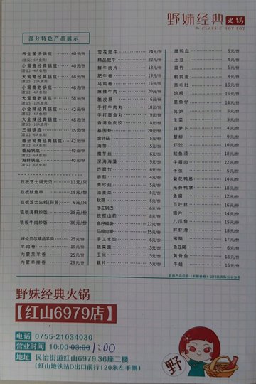 野妹经典火锅 (红山6979) (深圳) 网址: https://s.openrice.com/KtLS0W0eZPQ00 地址: 深圳龙华区民治腾龙路与民宝路交汇处红山6979 2层 电话: +86 21034030