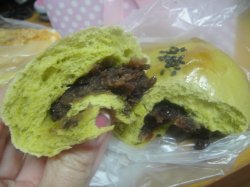 这家金凤呈祥就在单位附近,楼下是面包和饮料,楼上还有一个可以DIY课堂的地方,以及舒服的咖啡座。每天走过路过,经常来不及吃早餐的时候顺道买面包裹腹。这个是肉松卷,外面是面包状的,里面是蛋糕体,非常松软煊乎,两种不同质地卷在一起更丰富了口感,里面夹了很多的沙拉酱,外面沾满了厚厚的肉松,还有涂着蛋液烤过,非常好吃。红豆和抹茶都是我的爱,这个抹茶红豆面包,一举两得,可爱的外表一下子就击中了我的心。面包不大,小小的圆圆的,很可爱,绿色的光滑表面上面还点缀了几粒烤香的黑芝麻。里面是慢慢的红豆馅,真的超级超级多哦,红豆沙细腻绵烂,恰到好吃的微甜。面包外皮的抹茶也够浓郁,很清香,整体非常好吃。