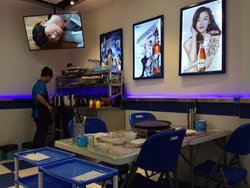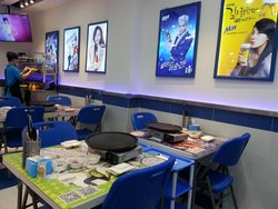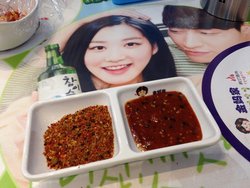 很是幸运的得到了这次金妈家韩式烤肉的机会,早早的就来到了试吃地方,这个地方在较场口日月光广场的右手边这个30度街吧这条街上,一直往里面走,然后右手边就能够看到起这家店的门面了。砖墙式的建筑物的感觉,然后蓝色的栏杆,外面也有搭的蓝色的雨棚的座位区域。在外面吃感觉也不错的。他们家logo用灯光照亮了的。然后下面还有韩语的字样,反正我看不懂它,呵呵!进到里面灯光感觉非常的明亮,白色的桌子,然后加上蓝色的塑料椅子。墙上有韩国明星的照片,旁边也有电视在播放韩国的视频。然后进门的右手边也有一个投影仪在播放韩国的视频,店店里面韩国的音乐播放起的,感觉很浓烈的韩国气息,有点HIGH的音乐。最里面有一个饮料区域,冰柜里面全部放的韩国的饮品以及啤酒,清酒这些。反正品种很是多的。看到反正是很想每种都拿来试一试的冲动,很是稀奇!桌子放好了烤炉,和配菜,以及调料。调料有两种,一种辣椒粉,一种沾肉的酱料。配菜有泡萝卜,辣白菜,豆芽和青菜。中间放了蒜瓣和青椒丝。在这里学会了一种烤肉吃法,就是烤肉烤好以后,先沾酱料,再沾辣椒粉,再放在生菜上面,然后再放点蒜瓣和青椒丝,裹在一起就可以吃啦!老板很热情的拿出来他们店里面的米酒,我喝了一下感觉还是可以的,白色的液体。但是对于不喝酒的偶来说,喝不出来这个好不好啦!然后我们自己根据自己的爱好去选择了饮料,我选了一瓶黑豆浆,玻璃瓶装的,感觉味道还是多好喝的!他们家招牌嘎嘎,小鲜肉和五花肉,烤起好有诱惑的哟!感觉小鲜肉剪小点还是好吃些,五花肉值得推荐,瘦肉和肥肉比例刚好,吃起一点都不油腻。基围虾,感觉还是多新鲜的,个头也还算大的。价格是原价38元一份。超级鱿鱼,好大的鱿鱼啊,48元一份。烤的时候还会有收缩的状态。看到还多稀奇的。鸡脆骨,火腿肠。这个烤起也是另外的一种感觉。感觉也是还可以的。炒年糕,这个菜值得推荐,上面还撒有芝麻和葱花。我觉得味道挺好吃的,是我吃到的炒年糕里面的店店最好吃的一家了。石锅拌饭,这个个人觉得味道有点咸了。牛肉拌饭则咸味就要好些,吃起不咸。总体感觉还是可以的。泡菜饼,有泡菜的味道,但是个人不是很喜欢,饼吃起的口感是软的。这家韩国气氛的金妈家韩式烤肉,环境和气氛都是挺不错的。喜欢嘎嘎的朋友可以去试一试的!