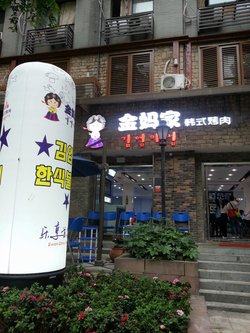 一直听别人说金妈家还不错,终于有机会来试了一试,不过感觉有点失望,只能说一般吧。 这家店就在较场口那个石灰市的30度街吧那里,往上走一会就能看到了,在右边的。 他们的环境一般,有点像快餐店的感觉,不过有好几冰柜的饮料,品种非常之多,很多韩国饮料。 我就要了一瓶黑豆浆,最近想喝营养一点- - 招牌的【五花肉】确实切得很厚实,很大一块,肥瘦兼半,感觉应该很好吃的。 但是可能由于是电烤,所以烤下来有点腻,一边烤一边也能闻到很大的油味,感觉没吃都腻了一半了。 所以这个一定是要包生菜才能吃的,作料主要有2种,一种干辣椒粉的,一种韩式酱。 【小鲜肉】没有五花肉那么肥,所以吃起来要稍微好一点,不过吃多了也还是腻。 相对来说,我觉得【牛肉】更好吃,没有那么多脂肪,就是烤了马上要吃,不然在那放一会就会被边缘的热气烤老了,本来还是挺嫩的。 【豆腐】之前还没怎么吃过这种来烤的,感觉还不错,一点不腻,香香的,还是吃点素好啊。 【鸡胗】还不错的,以前烧烤就经常吃,也是不能烤太久了,【鸡中宝】也还行吧,很多脆骨。他们这的【韩式泡菜饼】还不错,比较香,端上来时色泽金黄饱满,很有食欲,石锅饭还行,比较清爽解腻。 我们这是一个台湾阿姨给烤的,一边烤一边教我们怎么吃,还蛮有意思的,炒年糕还行,也是腻了点。 就是总的来说,没有一道特别有特色,可以给人留下深刻印象的菜品,所以有点失望,感觉一般。