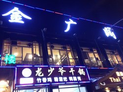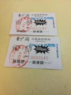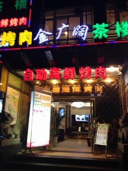 早就听说金广阔自助海鲜烤肉很巴适,但因为种种原因一直没能成行,直到最近淘点点推出了半价活动,虽然有效期只有一个多星期,还是囤了两张券,在去与不去之间纠结了好几天,最后终于在截止日期的最后几个小时前跑去使用了。店还比较好找,就在科华北路115号,龙少爷干锅的楼上,用餐区在二楼,楼下有沙发位可以坐着休息。到店正好晚上6点,人还不多,要入场用餐得先验证券号,付现金的得先买单,然后再交50元押金,用完餐后没有浪费再返还。交了押金后,会发你两张票,交给用餐门口的工作人员后就可以进去了,虽然也理解商家的做法,但是还是感觉有点小怪哈。用餐区堂子还是挺大的,菜品摆放的很集中,这点比较好,拿菜取菜很方便,菜品种类不算特别多,但是该有的基本上都有了。海鲜有 【扇贝】、【生蚝】、【虾】、【秋刀鱼】、【墨鱼仔】、【鱿鱼须】、【小黄鱼】、【昌鱼】、【鳕鱼】、【带鱼】等,说下吃过的几种吧【扇贝】:上面夹了不少粉丝,扇贝肉不多,味道还可以。【生蚝】:同样放了粉丝,是生蚝肉的两倍,肉吃起还比较鲜。【虾】:夹了三个,烤起很快,剥壳太麻烦,肉挺大只。【秋刀鱼】:烤了一条,很好吃,和日食店煎的味道差不多,唯一区别是没有柠檬可以挤汁,不过吃起没有腥味。【墨鱼仔】:烤了三个,不太好吃,没什么味道,当然这不是它的错,可能是自己的技术原因。【鱿鱼须】:最先夹的就是这个,虽然没放什么辣椒粉等作料,但味道很好。【鳕鱼】:煎了一块,外面有一层冰,煎的时候一直出水,煎出来倒是很嫩。【脑花】:一小碗一小碗装好的,直接拿锡箔小碗烤,味道中规中距的,没什么味道。【鲫鱼】:烤出来鱼肉没什么味道,因为肚子里面装了泡豇豆的,所以肚子附近的肉挺好吃的。肉食区有【鸡翅】、【排骨】、【五花肉】、【培根】、【兔腰】、【肥肠】等,我们就只吃了几样,【排骨】:很大块,烤的时间有点久,味道一般。【五花肉】:最后加的一份,一份就两三片的样子,比较嫩气。【兔腰】:无功无过,味道没有烫在火锅里那么好吃。【肥肠】:里面有很多肥油,烤出来挺好吃的,但是感觉不健康。熟食区:有凉拌菜、热菜、卤菜、炒饭等,到店先吞了一个肉丸子,【肉丸子】看着就挺好吃的,味道也确实不错,吃着很香,就是太咸了。【卤鸭头】最近狂爱鸭头,卤的很入味,五香味的,吃起不辣,非常香。另外还尝了点 【凉拌豆腐干】挺好吃的,几根【四季豆】味道也不错。其他菜品没有吃,肚子没有空间了。蒸炖区:有蒸蛋、银耳汤,还有一个什么没仔细看,都没有尝,味道不祥。小吃区,我就吃了【炸春卷】,不好吃,外皮都是软的。甜点区:【糕点】和【水果】,蛋糕之类的甜点都没碰,水果吃了西瓜和柚子,西瓜看卖相不杂滴,吃起很甜;柚子也好吃。调料区:有三种蘸酱,边上还放了不少配料,另外有酱油等调料,可以自已DIY,我打了三种蘸酱中的两种,干的还可以,其他一个基本没动。饮料区:全是机打饮料,有可乐、雪碧、橙汁、奶茶等,喝了两杯雪碧。另外还有冰淇淋机,冰淇淋味道一般。总结:团购性价比高,喜欢他家的卤菜,偶尔吃吃还挺不错的。