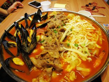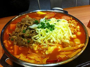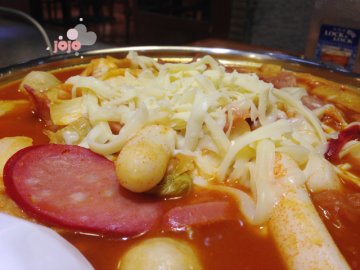 两个人去吃的话要点2种锅哦,原价的话不是很值得呢,团购去吃的比较划算了啦点的奶酪年糕锅和部队年糕锅,里面的芝士年糕真的是超级好吃啊,拉面在汤里面煮的软软的也非常入味芝士给的很多哦,有拉丝的,就是要小心点会沾锅底配菜有方腿肉,香肠,金针菇都不错,主要汤底好喝所以配菜也好吃啦