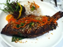 弟弟和妹妹去吃过,弟弟一直喜欢吃,这次终于答应他让他请我吃了,哈哈~!因为知道这家店的价格不便宜,而且越南菜我也不是非常的长草,不过去了之后,可能我们去的比较早还不是饭点,所以人不多,非常安静的就餐环境,越南式的装修,喜欢他们的大风扇缓缓的摇动着,我们正好对着露台,露台外有只小猫嘴馋的看着里面的食客们,听说是他们养的,服务员们也都穿着美貌的衣服,感觉真的非常的不错~说完环境再来说说菜式,因为弟弟有去吃过一次所以都是他点的一些比较受欢迎的菜,小食拼盘有很多东西但是味道都很一般吧,我是这样觉得的,南乳烧鸡很好吃~皮脆肉嫩,烤鱼的味道也很特别很有越菜的风格甜甜香香的,最喜欢吃的就是生牛肉河粉了,牛肉片是生的然后把汤汁浇上去,汤汁非常的鲜美,牛肉很能,还有的就是这个汤叫什么名字我想不起来了,但是里面的料都非常的多,有干贝虾粒芹菜粒等,非常的醇厚鲜美,很好吃~还有就是他们的玫瑰露非常的好喝味道很浓郁,而且可以免费续杯~总的来说土气的餐厅名字但环境和菜式都是非常的独特,价格也稍微贵了点,但是想吃越南菜的话难办去吃一下也没问题~查看更多
