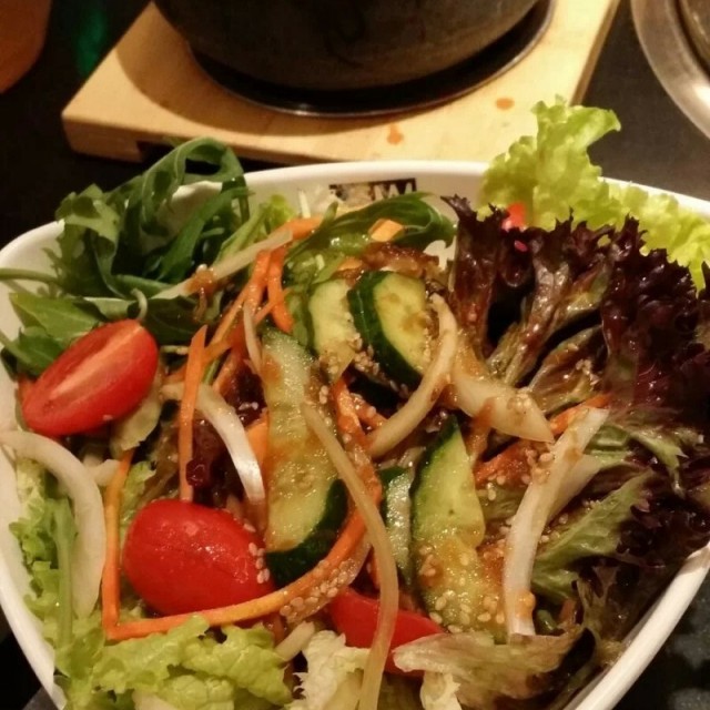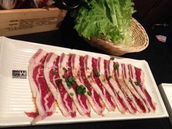 一家比较老牌的韩式料理店,点了一份泡菜饼,红红的颜色,吃起来没有想象中的冲辣的味道,大众都能够接受。烤五花肉是在烤盘上滋滋作响以及颜色渐变的过程也是一种欣赏,刚烤熟的肉放在生菜里面包起来,一大口咬下去,那种满足的感觉,棒。