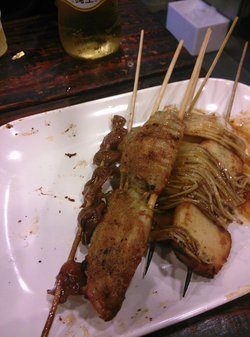 阿康烧烤 这家烧烤店是常年驻扎在这条步行街上的,烧烤的品种特别多,烤馒头,金针菇,香菇,肉串,骨肉相连,年糕都有的,很爱吃金针菇,烤的不光味道很香,而且金针菇还很水嫩的。