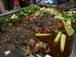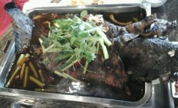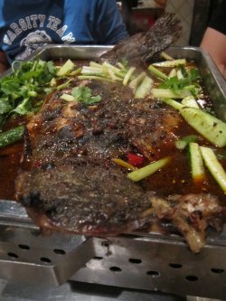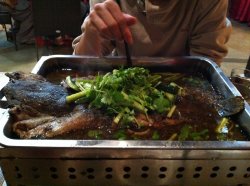哈尼和他的同事约的地方据说他们吃过觉得蛮好吃的又约了去吃烤鱼,我也去个个闹忙我们去的时候迟到了烤鱼已经烤上桌一会了去的真是时候,虽说点的是微辣但是正和我意,不算很辣呢而且汤汁都烧进去了,味道哈赞点了条6.8斤的鲶鱼刺少,肉多,鲜香肥美尤其是喜欢是吃皮下和鱼肉之间的那层油脂口感很好还点了点其他的菜,醉蟹脚肉丸烧洋葱,辣椒猪腰烧洋葱,辣椒肉片烧洋葱,辣椒菜式都很简单,不知道为什么都用洋葱,辣椒烧不过烧出的味道都不一样,也不错呢最后吃完碳烤鱼,觉得不尽兴,又点了条三斤多的不过明显没有第一条那么肥美呢这家的碳烤鱼还是满推荐的,最好等烧的入味点再吃查看更多