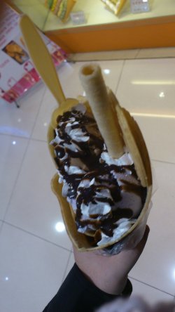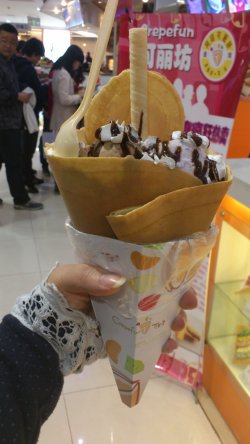 日月光是美食的天堂,来过的人都赞叹这里的美味,东西选择性多,而且味道也不错,集合了各种类型的小吃,价格也很平民。去年吧,日月光开了一个台湾美食馆,这个地方不大,但是开了好多家台湾的美食小铺子。有一次路过,看到一个mm拿了一个很大的可丽饼,可把我馋住了,然后我就在日月光里面兜了一圈,终于在这个新开的台湾美食馆里找到了它的身影。这个是橱窗,都是模型,看着超级诱人的。有很多选择,甜的咸的都有。这种应该算甜品吧,比较偏向于甜味的,而且甜味的似乎比较多。里面还有水果什么的,感觉很健康。于是就要了一个,还加了冰激凌球,一个是香草味道的,还有一个是巧克力味道的,拿在手上感觉沉甸甸的,量还是蛮大的,尤其是那个饼,很大一个,还给一个勺子可以挖着吃。感觉不错。最上面是奶油,还加了巧克力酱,给个特写。奶油味道不错,甜甜的,很软的,很细腻的,不算很腻,巧克力很甜,但是很好吃,有点像在吃圣代的感觉。两个冰激凌球味道不错,尤其是那个香芋的,非常好吃,味道和小时候吃的香芋杯差不多,甜甜的,很香。巧克力的冰激凌球味道比较一般,苦苦的,奶味明显不足,感觉冰渣渣的。还有块小饼和一根蛋卷,那个都不太好吃,应该是装饰,为好看吧。下面就不好吃了,像蒟蒻一样,很甜,外面那个饼是脆的,味道也不行,就吃完了奶油和冰激凌,下面的东西基本上就丢掉了。价格不便宜,感觉不是很实惠,主要是觉得样子好看,图个新鲜吧,下次不会再买了。查看更多