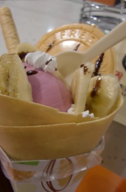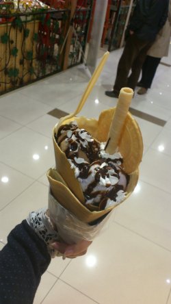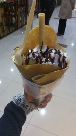 纯粹是因为好看才买了可丽饼,记得以前吃过一次,感觉很腻,而且味道不便宜,这次再次尝试,又证明了我之前那个观点。上面放的全是奶油,而且味道真心腻,一点都不好吃。冰激凌球倒还不错,选的是香芋和巧克力的,香芋的好吃,很香,巧克力味道很淡,而且冰很多查看更多