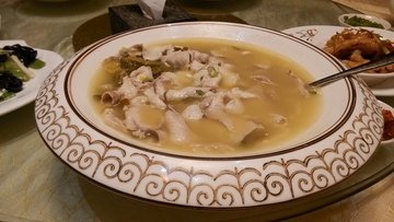 这家饭店在以前还是很有名气的,非常高大上的一家,但是现在也开始亲民啦。我们是38节团购去的,还有包房。他家地方很好找,就在陆军总院对面,服务还可以吧,环境很上档次,但是一看就比较陈旧了,我们去的包房叫做励志厅。包房里有空调,电视,衣柜,有一个榻,还有一个古筝,这个是有人弹的,不过我们去的时候没有了。一共13盘菜,我们5个人吃的,还可以吧,味道一般,但是感觉很讲究,必须表扬一下细节,盘子上都有手绘的画,画的国画,很好看,很雅致。【极品酸菜鱼】128元,这个量挺大的,鱼做的也不错,是片好的,雪白的鱼肉,没吃出来什么鱼,南方的酸菜,汤是青色的很透亮,味道很鲜,不过带刺的东西我有点吃不好,所以吃的比较少。【椒盐海虾】128元,这个量不算多,不过也都够吃了,盘子是白色的,一半放的虾,一半画的画,虾是过油然后椒盐的,我个人很喜欢吃椒盐的东西,虾的皮已经炸的脆了,所以椒盐之后可以直接连皮咬着吃,味道不错。【鸿运脆皮猪肘】98元,这个有点像熟食,肉是被切好的块和片,肉皮和肉也分开了,颜色有点艳红,味道有点干,这个不算太好吃。【拍蒜豉汁蒸排骨】68元, 这个也是白色盘子,上面还有小花,这个排骨都是小块的,有酱汁淋上,这个味道也一般吧。【朱公清酒煮高粱】48元,这个菜做的很有意思,是高粱米炒的云豆丁加的松子仁,很有创意,很有意思,但是味道实在不怎么样,太清淡了,说不好它是主食还是菜了。【香拌穿心莲】38元,这个菜我特别喜欢,穿心莲本身就很喜欢,这个主要是调味,他家调的有点果汁的感觉,说不好,但是感觉很特别。【蒜香凤爪】38元,这个我特别喜欢吃,这个味道非常好,凤爪是脱骨的,属于凉拌,味道有甜酸,有微麻微辣,很爽口。【养颜小炒】38元,这个很清淡,女孩都很喜欢,是木耳,荷兰豆加百合炒的,感觉很清新。【三鲜蒸饺】28元,一整屉上的,虾仁小到吃不出来,感觉一般吧。【菠汁炒饭】36元,就是绿色的炒饭,这个和正常的炒饭没什么差异,只是颜色上不同,不喜欢这个。【如意黄金果】48元,这个倒是挺好吃的,是金色的炸的,咬开之后里面有芋头,这个本事没有什么味道,有两个酱汁,一个是炼乳的,一个是橘汁的,这个是很好吃的甜品。【菊花茶】38元,这个也要提一提,颜色味道都很好,不是免费那种,不错。【果盘】38元,这个是今天最受女士们欢迎的,里面有哈密瓜和西瓜,还比较多,很新鲜。饭后非常适合。值得一说的是,去的时候是3.8节,服务人员还每人送了一只鲜花,细节上有时候可以让人体验更好。…查看更多