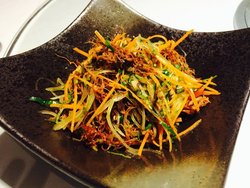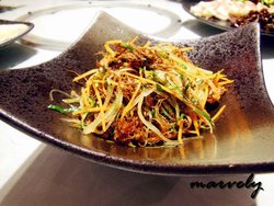 云南野菜饼,28元一份。据说饼里的野菜是从云南空运来的,饼身很薄,做的也很脆,可以看到两层饼皮之间因为油炸过后形成的空间,不过我个人并不是很喜欢这个饼的味道,有些平淡,而且厨房配的蘸酱似乎也有些过酸了。查看更多