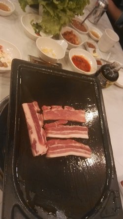 韩时烤肉不是明火烤肉,烤盘是个铁盘子,个头超大,可以同时烤两盘肉,人多一起吃饭挺好的,一次可以烤很多。猪肉其实烤着吃很香,里脊肉肉嫩多汁,最好吃的是猪五花,肥瘦相间,吃着不油腻,因为肥油都烤了出去,用生菜配着蒜片卷着吃很爽口。查看更多