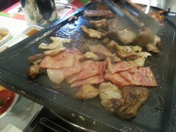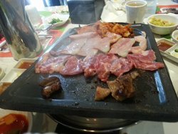 韩时烤肉的环境很好,餐厅的落地窗很吸引人,天气好的时候坐在窗边很舒服。点了一份猪肉拼盘,价格有些小贵,不过种类还是挺多的,五花肉,排骨肉,猪颈肉等,还是比较喜欢吃五花肉,肥瘦相间的肉吃着干而不柴,烤的微焦,吃着很有嚼劲,香味浓郁,吃着不油腻,很爽口。查看更多