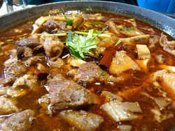 这家店就在闹市口大街,周末带儿子来吃的牛板筋火锅,148元一锅,我们三口足够吃了,板筋一点不会塞牙,都炖透了,很好嚼碎,个别带肉筋的也都是脆骨那些。吃完还可以涮一些蔬菜。查看更多