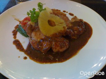班前先预定一个位,接电话的服务员这点不错,先问我是不是某网团券来的,成功预约。下班过去的路上还飘着毛毛雨,也就在电影院的边上,新世界的斜对面,开了好多餐饮店吗,备着以后再过来扫~电梯上去,靠窗的一排基本不是满了就是预约掉了,好位子都没有了,是有个专门的区域给团友的,灯光比较昏暗。环境离港式茶餐厅的风格有点远,走时尚简约风,相对还不错,听说吃饭停车还免费了,这对开车的朋友来说是个福音,呵呵~套餐当中有主食4选2,还有饮料随便选,汤我是忌廉汤和罗宋汤各一,选择搭配还算自由。饮料挑选了一杯冰冻芒果乳酸,原价16元,是吃好了最后再上次,次序有些颠倒,一般饮料应该先上,有待改善,味道还行,里面有细小的冰沙,偏甜了点~虎牌啤酒 大瓶子的 15元原价,可以到上2杯左右,喝啤酒看足球比较有feel;汤我觉得罗宋汤还不错,忌廉的味道就淡了些;配了4片蒜香片,有点冷了,所以不是很脆的样子;主菜选了意式烧鸡配烧汁酱,48元原价,里面还搭配了西兰花、薯条、玉米粒,皮有点脆脆的,肉也不算老,就是那个烧汁酱偏淡了些~炭烧猪颈肉 原价52元 配菜跟上面一致,猪颈肉片儿大,大约5片的样子,蛮Q的,配了黑胡椒酱,口感不错;还有个蒜蓉74焗生蚝,个头中等,吃了一只,74多放点就嗲了;客人一多,服务就有些跟不上的说,最后吃晚饭还给了一张小纸片写了些服务评鉴~这个我拿手,哈哈~58元能吃到这些性价比酸挺高了,呵呵~ 环境acc的,比较适合情侣过来碰个头,幽个会的,还有无线上网,下次等人的时候可以考虑一记~希望推出一些冰沙系列,看看他家的咖啡品种也不算多,不知道有没有下午茶套餐~~…查看更多