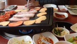 在魏公村街14号,装修比较简单,也是有服务员帮忙烤肉的店子,所以比较方便的说。这个店的地方不大,里面的座位还是比较舒服的,通风也很好。五花肉是比较长一条的那种,需要剪过再烤,服务员手艺不错,肉烤的很焦嫩。梅花肉有4个大片,看起来很漂亮,因为也是服务员帮忙烤的,所以口感上非常好,是很滑嫩,也很入味的。这家还点了紫菜包饭,醋饭做的不够酸,里面裹得料是很够的,切得一厘米见宽,适口性强。