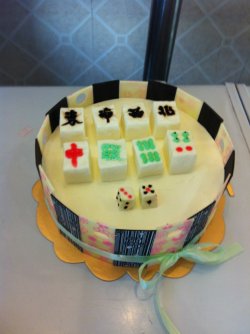 哈哈哈 团购的蛋糕 但是我要求可不可以加钱 然后帮我DIY一下爸爸过生日 由于他对麻将的热爱 我就心生一计 这样的蛋糕 他是必定会很中意的 哈哈哈果不其然 连邻居也纷纷来观摩这个麻将蛋糕 其实就是普通的提拉米苏 加上那几个DIY麻将啦!
