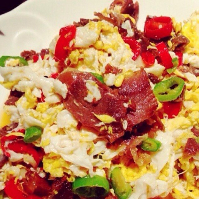 地方很大,适合小伙伴成群结伴的来聚会,大桌子都可以坐十几个人的。菜色倒是很多,分量不是很多。一个小炒腊牛肉特别香,大把的干红辣椒一起炒得,味道狠辣,牛肉特别有嚼劲的,牙齿 不好的可吃不了。还有一个水蒸蛋也特别不错,嫩嫩滑滑的,很受小伙伴的欢迎,我还没有来得及拍照片,就给他们破坏了。速度真快。
