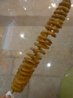 鸡排超人也开始卖旋风土豆了。他家的旋风土豆,只卖10元,价格算是很便宜了。店了之后,看见店员是现场操作的,土豆应该是事先切好穿好的,在油锅里炸大概一分钟左右,就起过了,店员问我要什么味道的,我问了句有哪些味道的,店员就指着一旁贴着的招贴,上面大概有7中左右的味道,我随口说要芥末味道的,店员倒是挺认真的,说芥末的不大好吃,要么我给你撒孜然椒盐的味道,说这个味道不错,于是我说可以,但是他撒完之后,我突然想吃甘梅味道的了,于是问可不可以帮我撒甘梅味道的,于是店员又帮我撒了一层甘梅味道的。于是我吃了一根甘梅和孜然味道混合的旋风土豆了。可能是甘梅的味道比较重吧,我几乎没太吃出孜然的味道,但是甘梅的味道还是很适合撒在土豆上吃的。不过土豆是很容易吸油的,所以吃起来会觉得有些油腻。查看更多