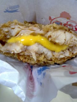 很早之前就在微博上疯传过那么一种鸡排,就是芝士鸡排~正好去中山公园那里玩,于是走到定西路的鸡排超人去寻找他~过去那天没什么人,但是因为是先炸的,所以很慢,等很久~不能切,只能一整块拿在手上,第一口咬下去还是只有嫩嫩的鸡肉,但是第2口马上就有嫩黄的芝士流出来了,因为怕烫,晾了一会儿,谁知芝士凝固起来了,更好吃了~于是接下去的吃法就是把芝士吹吹冷再吃~这么一块鸡排下去肚子很撑,很完美,和传说中的味道一样赞~查看更多