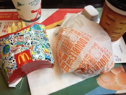 麦当劳里还是那些种类的食品、没啥心意、不过点个套餐还是很划算的呢。汉堡和薯条、麦当劳一直比肯德基里的味道好、生菜很新鲜、鸡肉就不太清楚了、不过还是一如既往的好吃啊查看更多