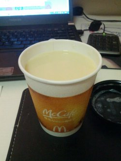 1月14日早饭,不记得是什么活动了,麦当劳有送早餐了,送了一个大腿扒麦满分,和一杯热豆浆。来不及了,所以打包带走了,蓝色包装的麦满分,还没打开就闻到一股很诱人的汉堡包香气,打开之后,看到厚厚的2片面包,夹了大腿肉,不薄的,还有蔬菜,咬一口,好满足哦,多汁的大腿肉,好喜欢,蔬菜挺脆的,面包可以吃饱呢。豆浆比较浓郁,和咖啡的杯子是一样的。比较结实,打包不会洒出来的。…查看更多