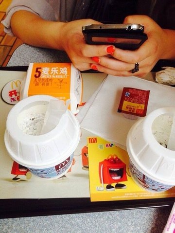 麦当劳的标志好大,很醒目,跟同学走累了,进来歇歇,里面的地方还挺大的,不是饭点,所以位子挺多,点了薯条,可乐,菠萝派,麦乐鸡等等,菠萝派好吃,外皮很酥,吃的时候会掉渣,里面一粒粒的菠萝,吃着很过瘾,麦乐鸡也很好吃。