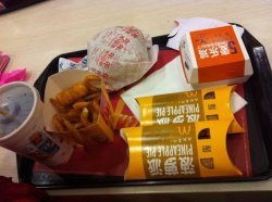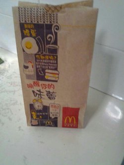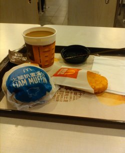 麦记的早饭,主要是比较卫生啦。。。火腿扒麦满分,一块火腿加一点蔬菜,能吃饱就好,最主要的是薯饼哈,麦当劳的薯饼很赞的,每次早饭必点,销量也很高的饮料是咖啡或豆浆,一般选豆浆,不习惯咖啡,这次坐在餐厅里吃就选咖啡试试,爱吃甜的,我加了两包糖