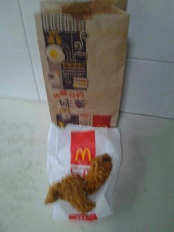 又是招行9积分兑换的活动,换了一对麻辣鸡翅,就近在亚新广场的麦当劳领了,报了兑换号码,取得很顺利。 麦辣鸡翅的味道还是很不错的,微微的辣,让人很开胃,外层炸得很香脆,内里的鸡肉还是挺嫩的。 另外再买了盒麦乐鸡带回家吃,一个人打发晚饭,麦乐鸡蘸蘸酱,吃起来方便。 这家分店服务还不错的,帮我兑换啥的,动作也挺迅速。