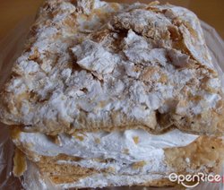 店布置得还宽敞,有点没有尽量利用的感觉。有的面包已包装好了。还有些散卖称斤的糕点。冷柜中有鲜奶、鲜奶蛋糕,可以订生日蛋糕。售货的阿姨只关心你买什么,别的一概不理。面包、糕点的价格不贵,可能因为不是新鲜出炉的。掼奶油:杯子很可爱,像宜芝多的,上面是奶牛的外衣。口感很不错,膨松柔滑,不比凯司令的差。味道也好,奶味很浓,吃在嘴里很香。只是吃多了有点腻。拿破仑:很大的一块,算得上较便宜。奶油和面皮一层层铺上去。面皮较脆,但可能不是当天出的,所以不是那么脆。奶油很纯正,软滑,很好吃。如果是新鲜的,味道就很不错了。黄金奶酪:加了些芝士的小蛋糕。外皮呈褐色,下面的蛋糕是金黄色的,颜色较好看。蛋糕很膨松柔软,有弹性。有点点芝士味在里面,只是太少了点。总体的味道还行。咸切片吐司:吐司较为新鲜,松软,有弹性。感觉不错。性价比不错的面包店。查看更多