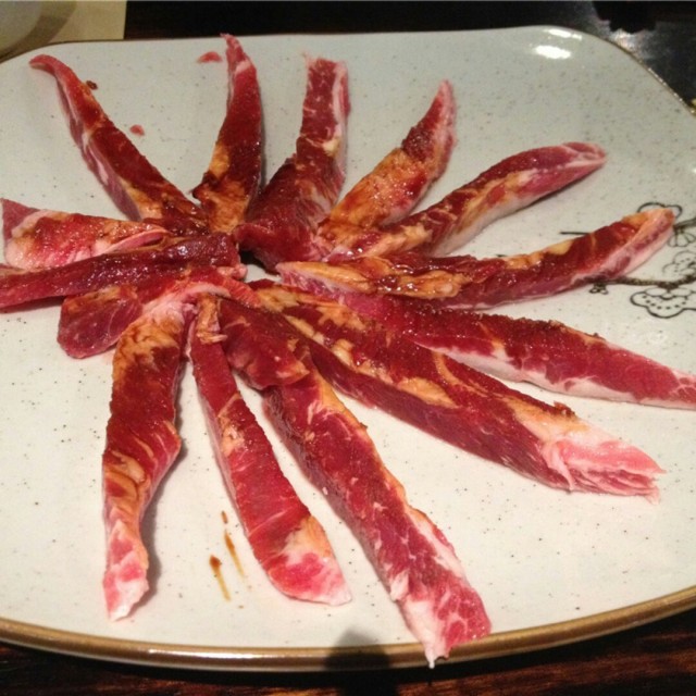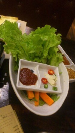 又是朋友请吃的,呵呵,这里蛮适合我们的,气氛很不错滴,秘制牛五花非常好吃,肥瘦相间的,口感嫩香,味道无话可说。牛舌切的厚度也蛮不错,口感稚嫩不腻,挺好吃的。元贝的口感也是可圈可点的吧。还有炸打糕,菌类拼盘都挺不错滴。